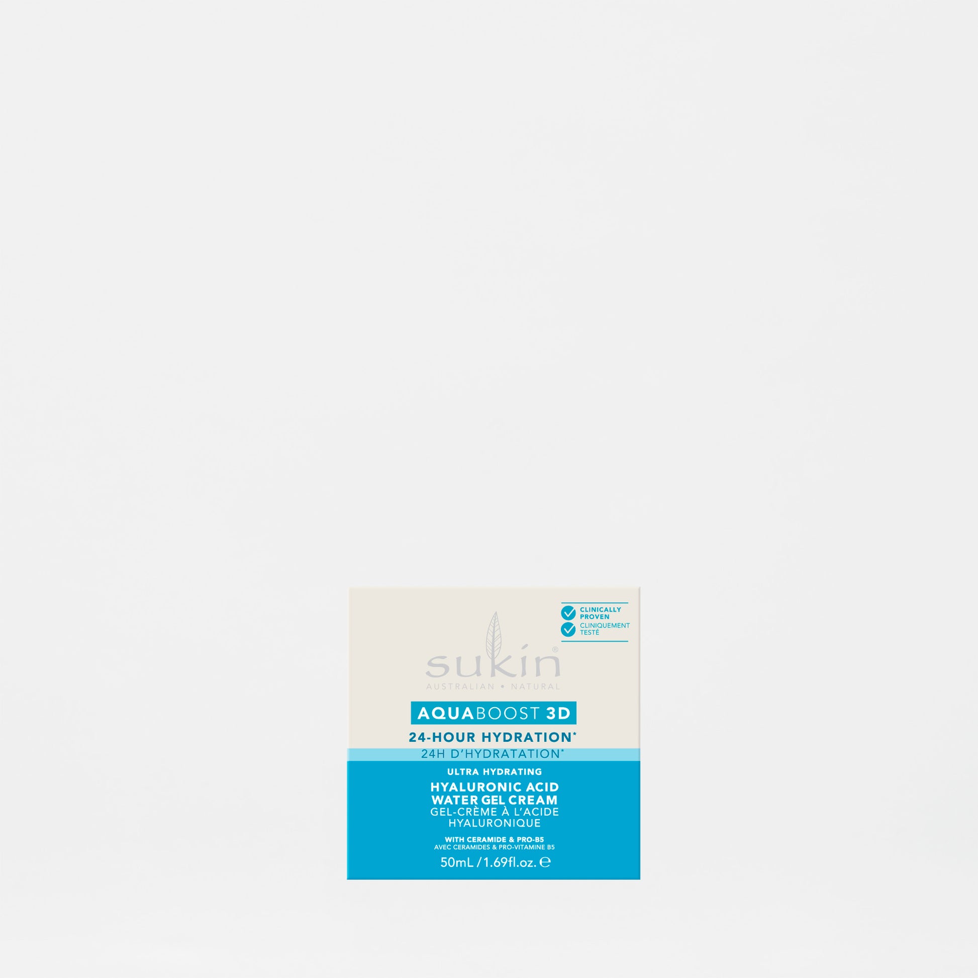 Experience daily skin renewal with Sukin AQUABOOST 3D Hyaluronic Acid Water Gel Cream. Developed in the Sukin Lab, this clinically proven formula offers 24-hour hydration, combining four types of Hyaluronic Acid with Niacinamide, Ceramide, and Australian Hibiscus. Beyond moisture, it strengthens the protective barrier, ensuring instant skin-smoothing and nourishing effects. Apply in the morning under makeup or at night time.