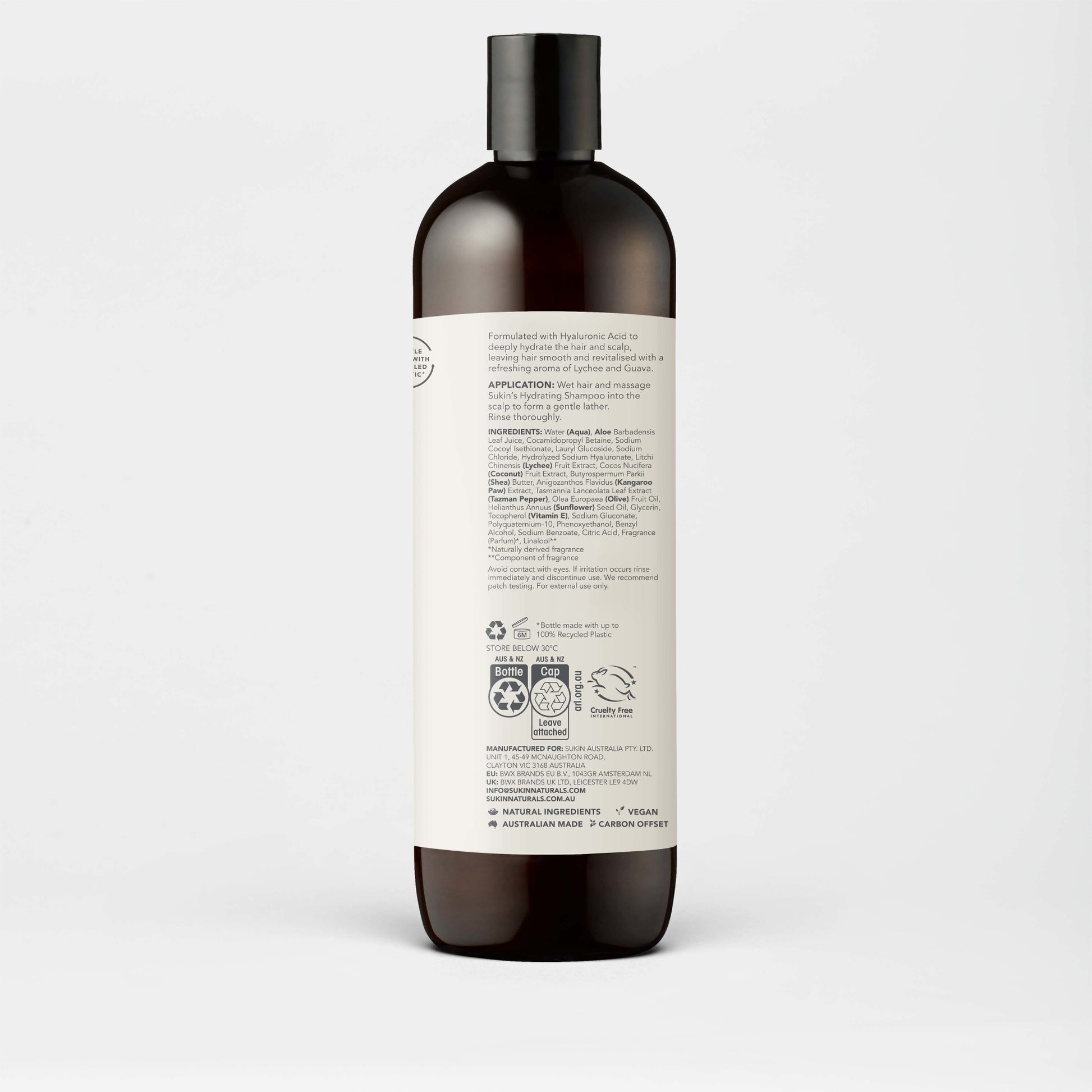 Sukin's Lychee and Pink Guava Hydrating Shampoo deeply hydrates with Hyaluronic Acid, leaving your hair soft, smooth, and shiny. The tropical blend of Lychee and Guava adds a refreshing fragrance while locking in moisture for vibrant, healthy hair., Formulated with Hyaluronic Acid to deeply hydrate the hair and scalp, leaving hair smooth and revitalised with a refreshing aroma of Lychee and Guava.